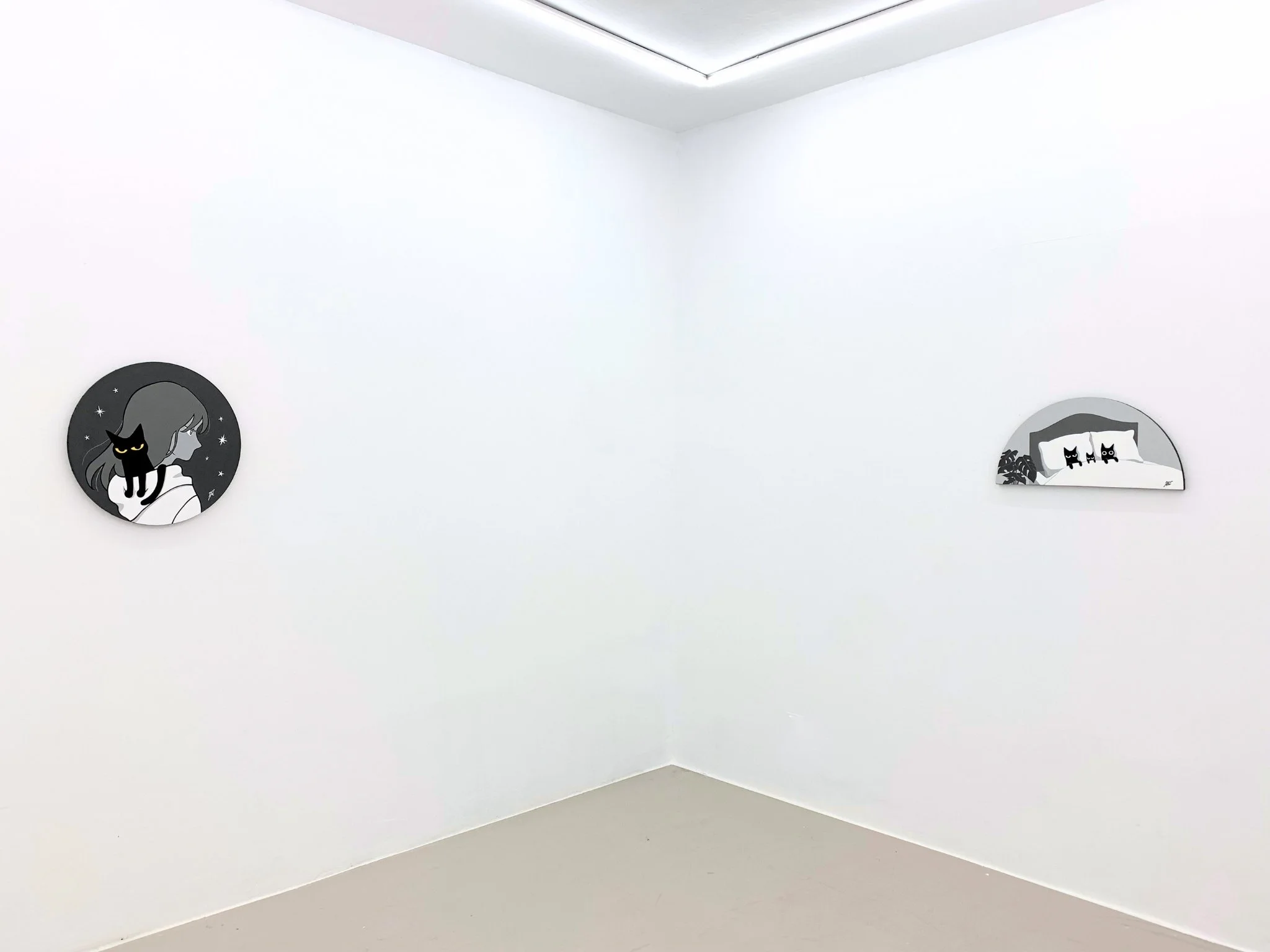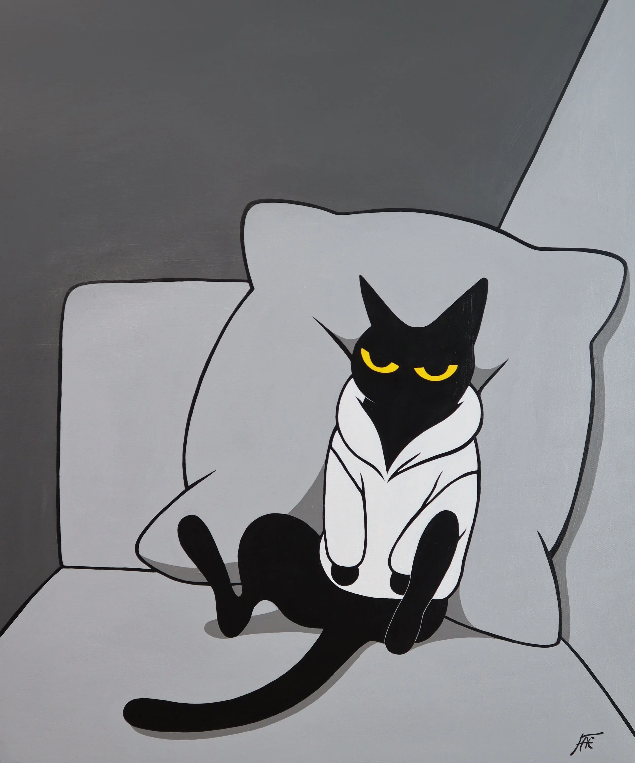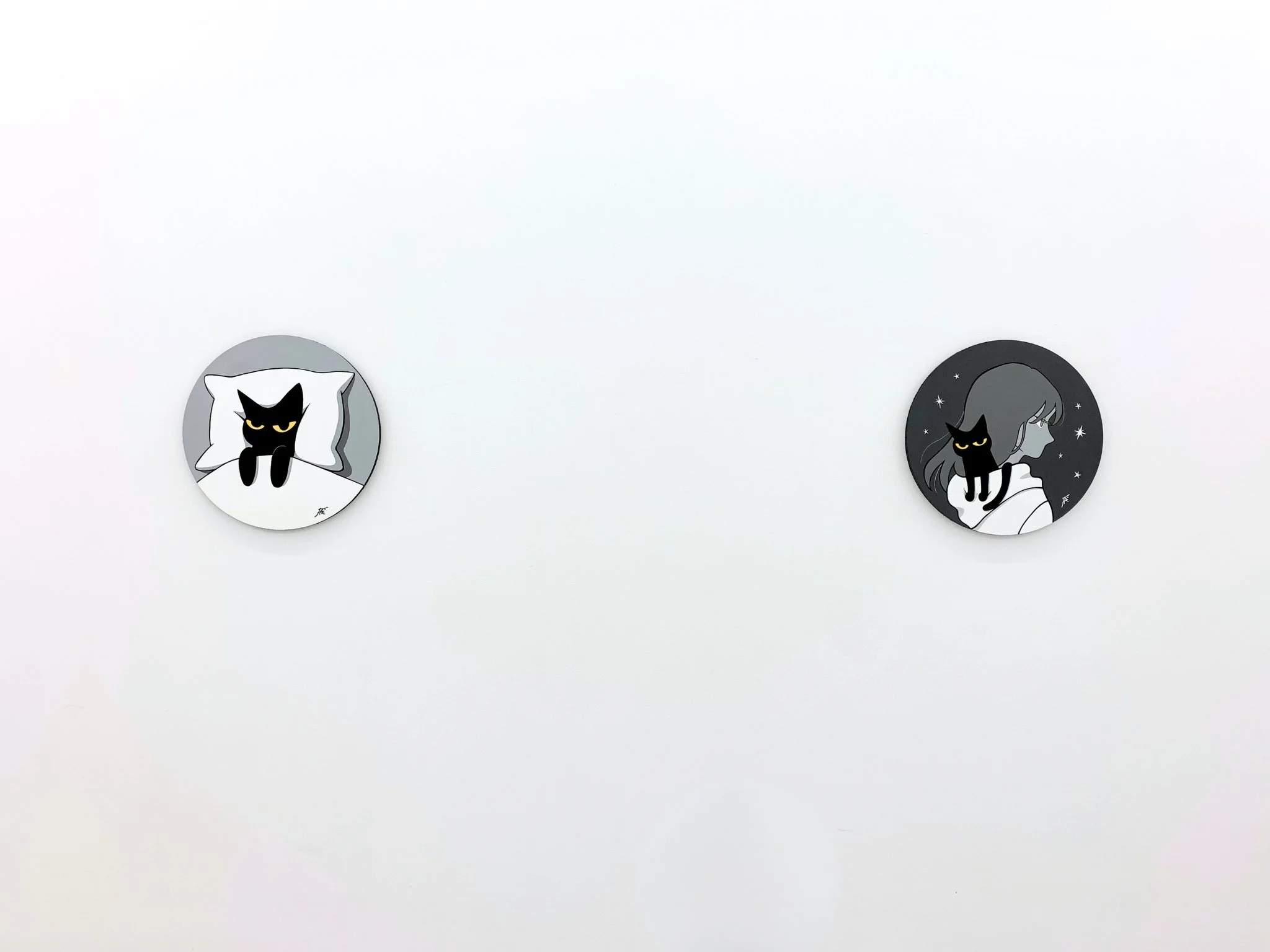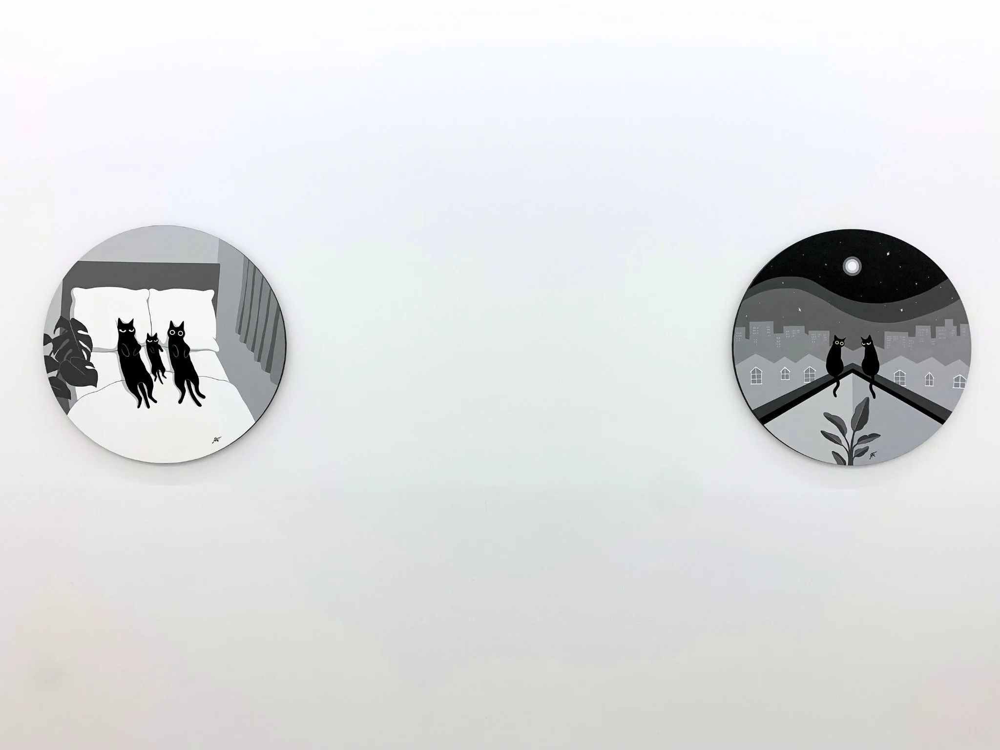 The contemporary artist Ai Funaki was born in Tokyo, Japan where she is currently based. In Ai Funaki's world, black cats often appear in her paintings, peering skeptically from the window sill, laying around the dining tables, stretching within fresh linen, playing in the living room, wandering across rooftops tiptoeing through the city nightscape… their bright yellow eyes always look back, piercing through the night with determination.