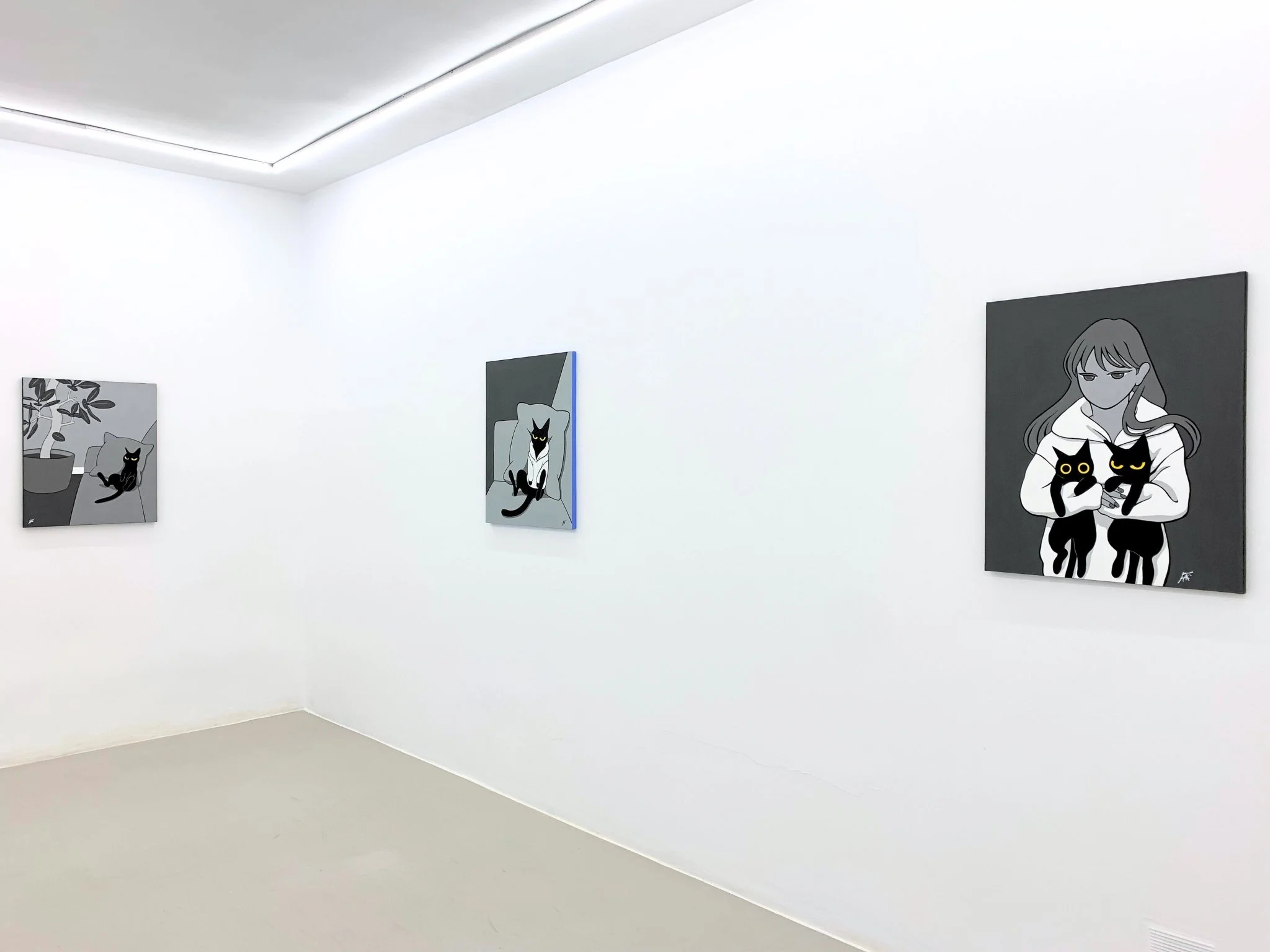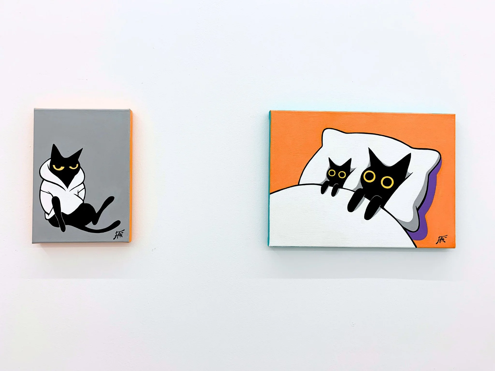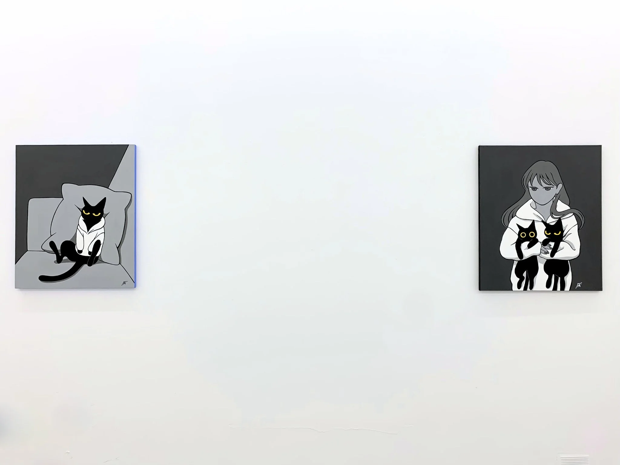 In the exhibition “Love and nostalgia”, the artist expressed her love and nostalgia through her black cat "Joe" and her family. Joe is like Ai. “Joe” enters into the world of paintings and expresses them for her. This world depicted by Ai Funaki and the cats is a world overflowing of the warmth and kindness she felt when she was young. However, this warmth can turn into sadness and pain the more we get to know love, which is why the backgrounds of her paintings are gray and monochrome. Through her paintings, the artist aims to bring a kinder world to the public. After all, love is not something sad for her, but the treasure of life that she represents in her drawings and paintings.